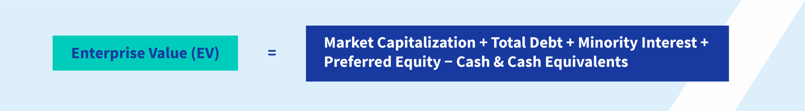 Enterprise Value (EV) = Market Capitalization + Total Debt + Minority Interest + Preferred Equity − Cash & Cash Equivalents
