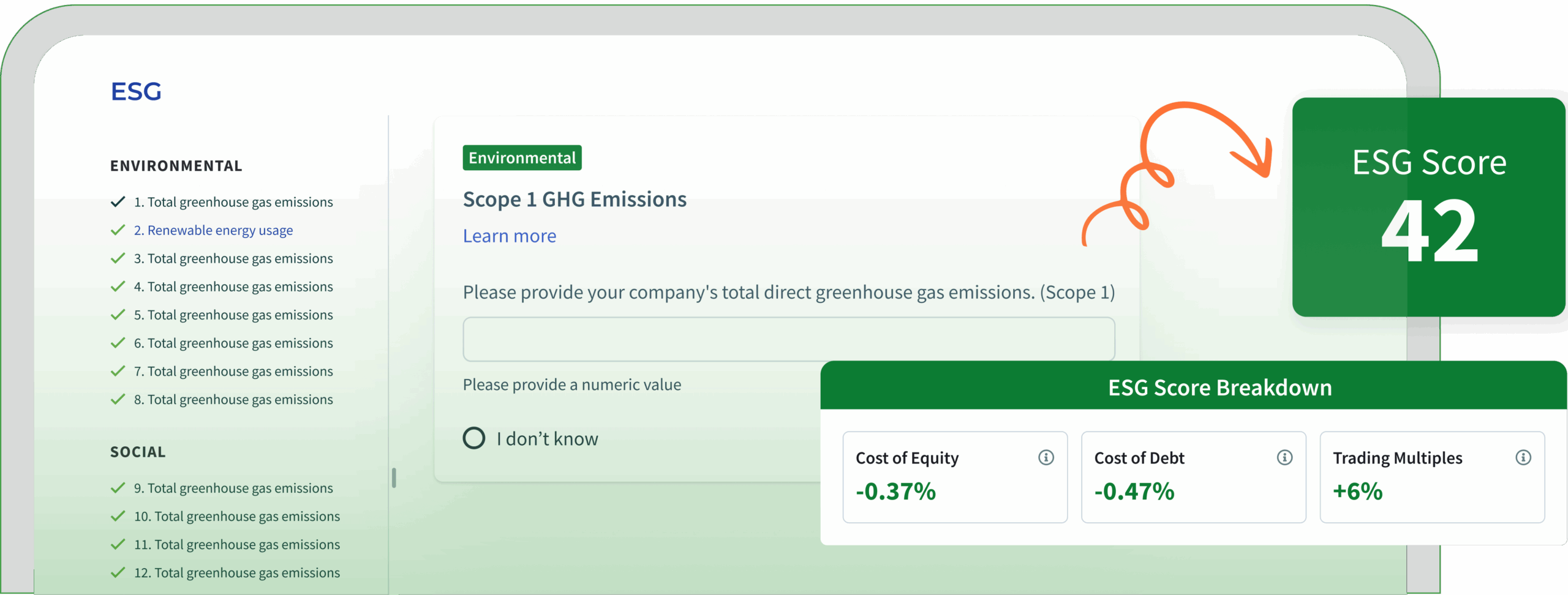 Use our simple yet powerful Environment, Social and Governance assessment of your target company to generate an ESG score, which enables: